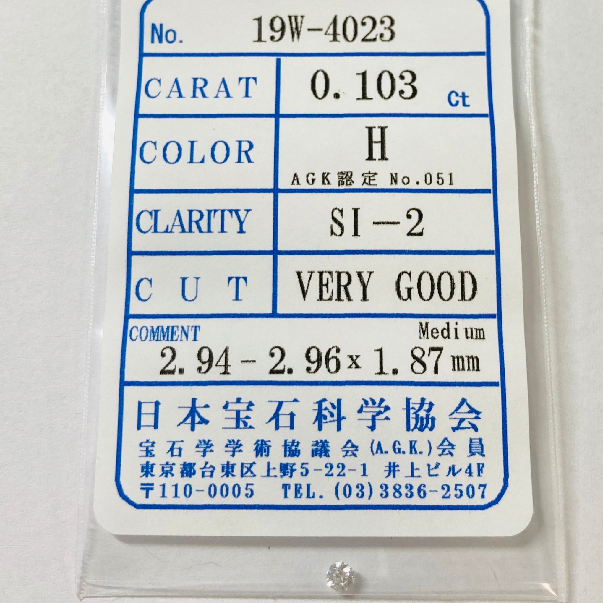 ダイヤモンド 0.103ct 蛍光:Medium 簡易ソーティング付き No:19W-4029