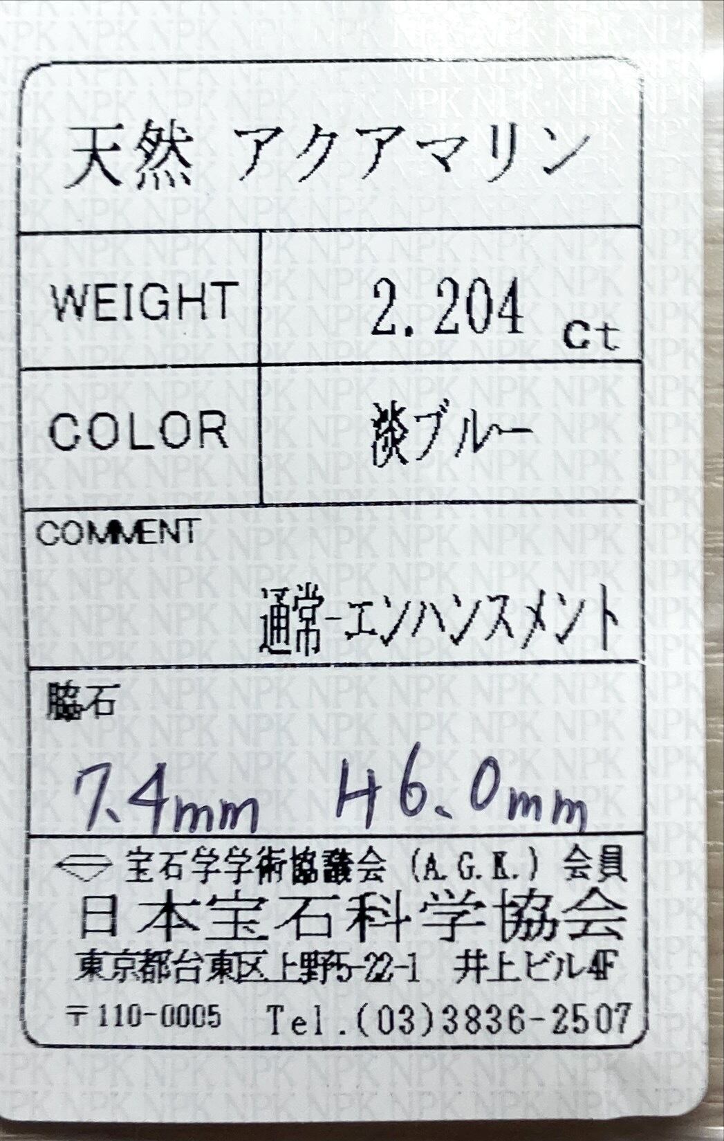 アクアマリン 2.204ct 淡ブルー 簡易ソーティング付き No.194