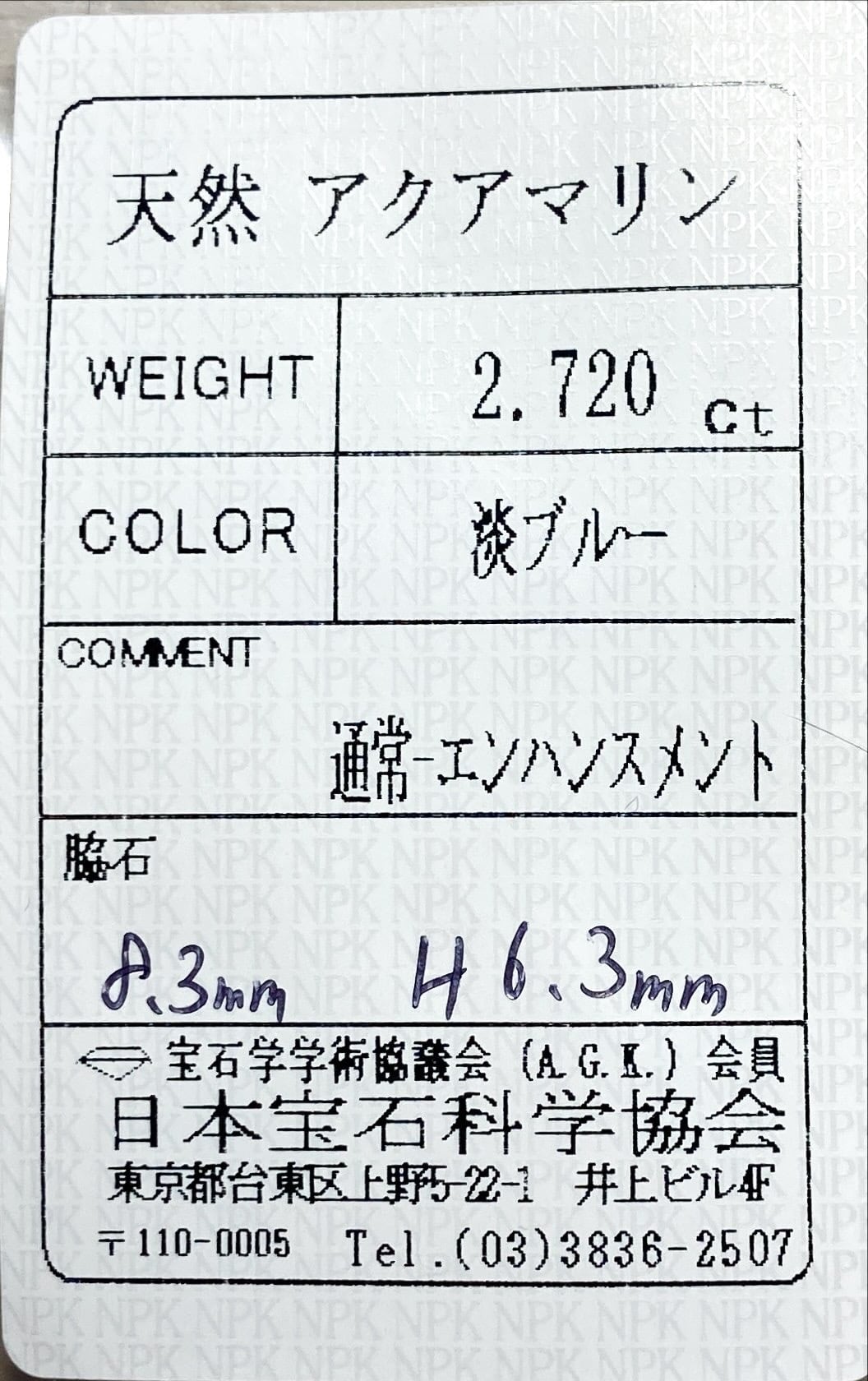 アクアマリン 2.720ct 淡ブルー 簡易ソーティング付き No.195